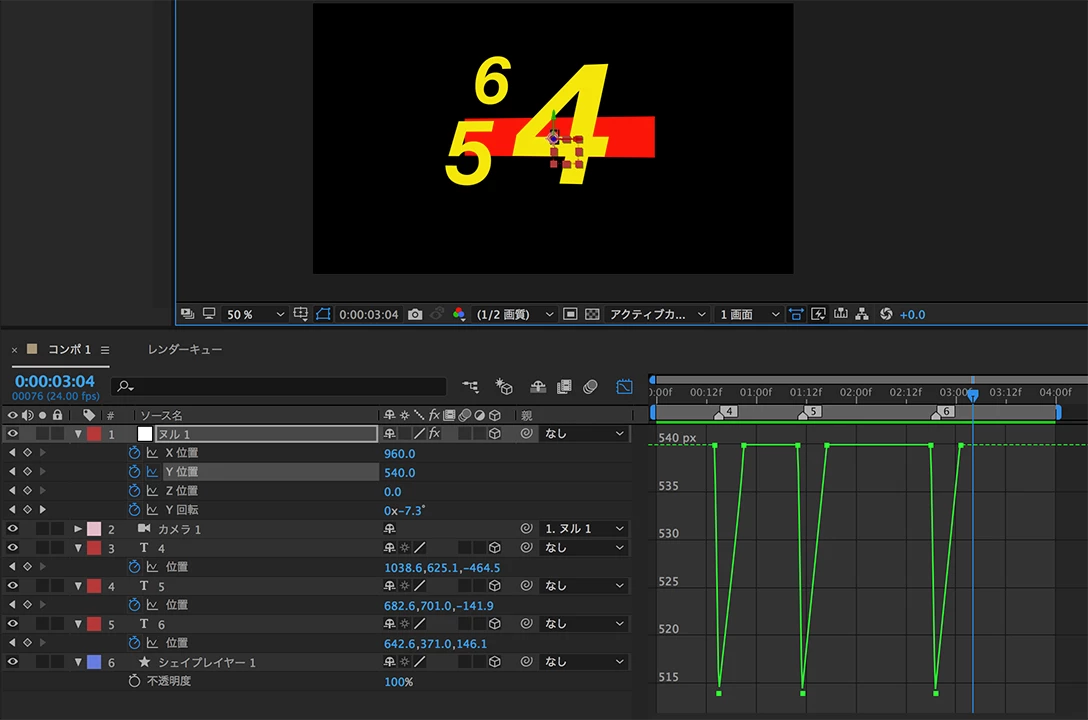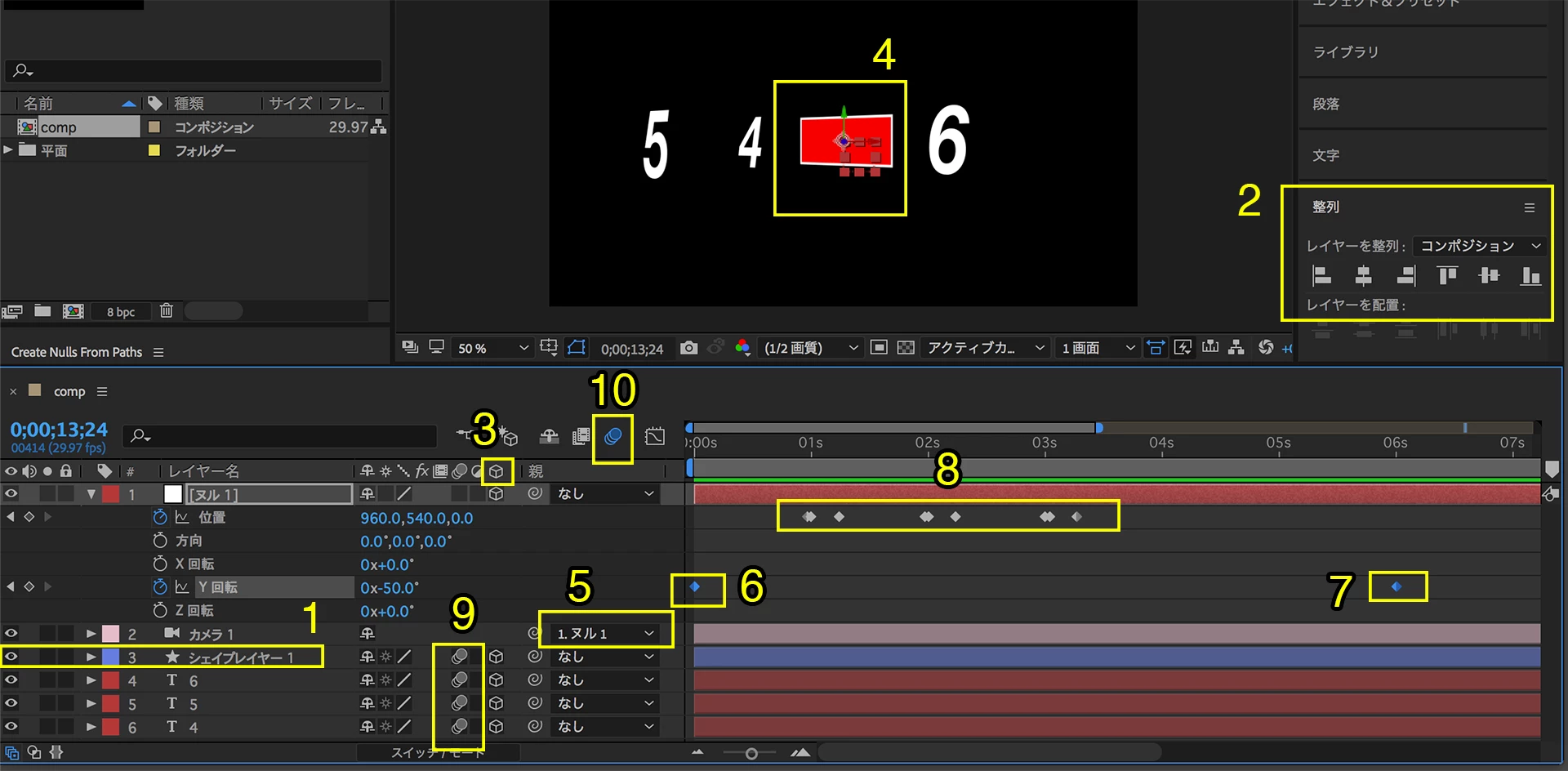 6. タイムライン0秒にヌル Y回転のキーを打ちます。