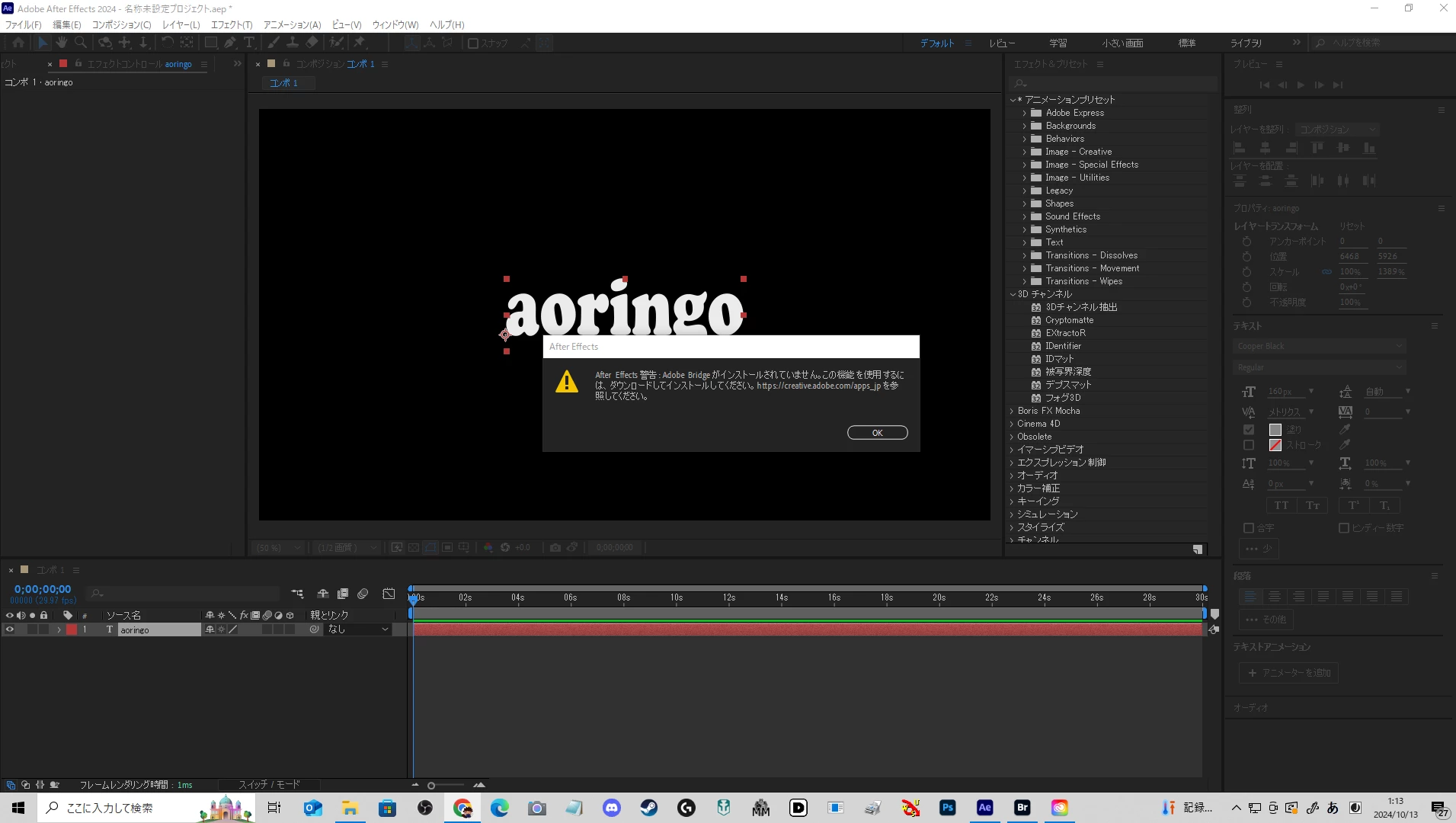 Brigde→After EffectではBrigdeからAfter EffectのフォルダのPresetsに入って各エフェクトを調べようとクリックするとAfter Effectが起動し、注意表示が出ます。
