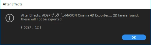 上の図は、c4dに書き出しできない2Dレイヤーが含まれている時に表示される注意及び確認の画面だと思われます。