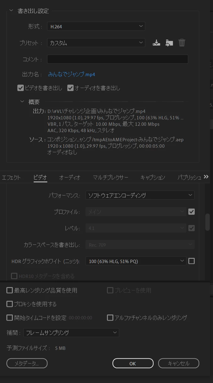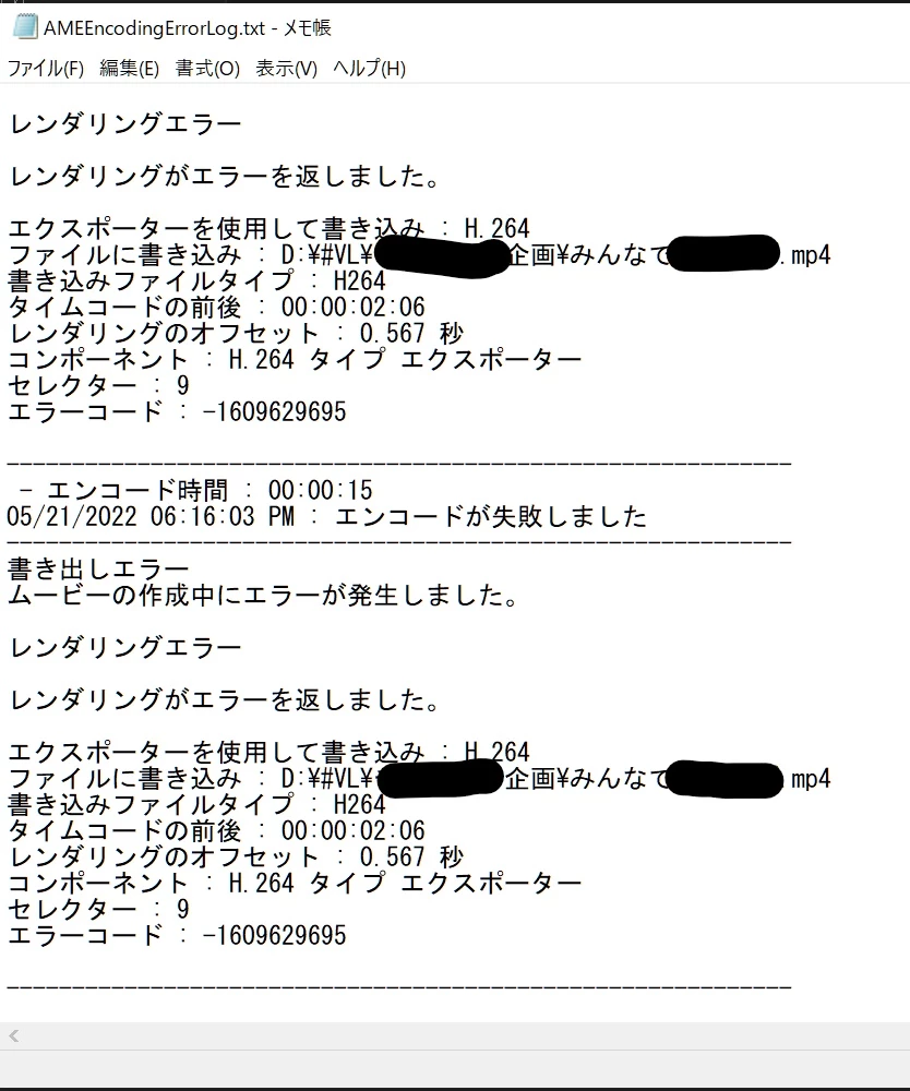 彰彰5C5FParticipantForum|Forum|3 years agoMay 21, 2022QuestionAfter EffectsからMedia Encoderで書き出しエラーForum|Forum|3 years agoMay 21, 20221 reply171 viewsAfter EffectsからAdobe Media Encoder での書き出しで エラーが出て書き出しが出来ません。 現在素材の違う2つのファイルで現象が起きています。当方、Windowsです。 ①PC、After Effectsの再起動 ②書き出し先を変更する ③レンダラーを変更する ④After Effects再インストール ⑤キャッシュの削除 等、いろいろ試してみたのですが、 どうやらH264での書き出しが出来ないようで AVIでの書き出しには成功しています。 MP4に書き出しを行いたいのですが どなたかわかる方おられたら、ご教示いただければ幸いです。 エラーまたは問題読み込みと書き出し