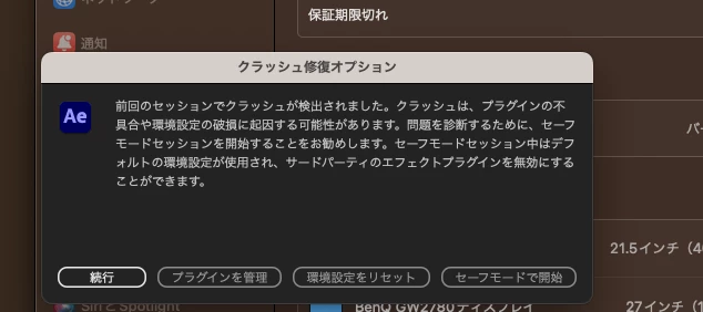 aftereffectsを押すと添付画像①のようにクラッシュ修復画面が表示されます