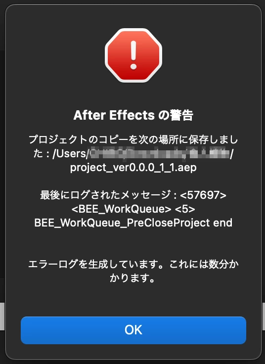 After Effectsの警告「プロジェクトのコピーを次の場所に保存しました」が出てOKを押すとシャットダウン。