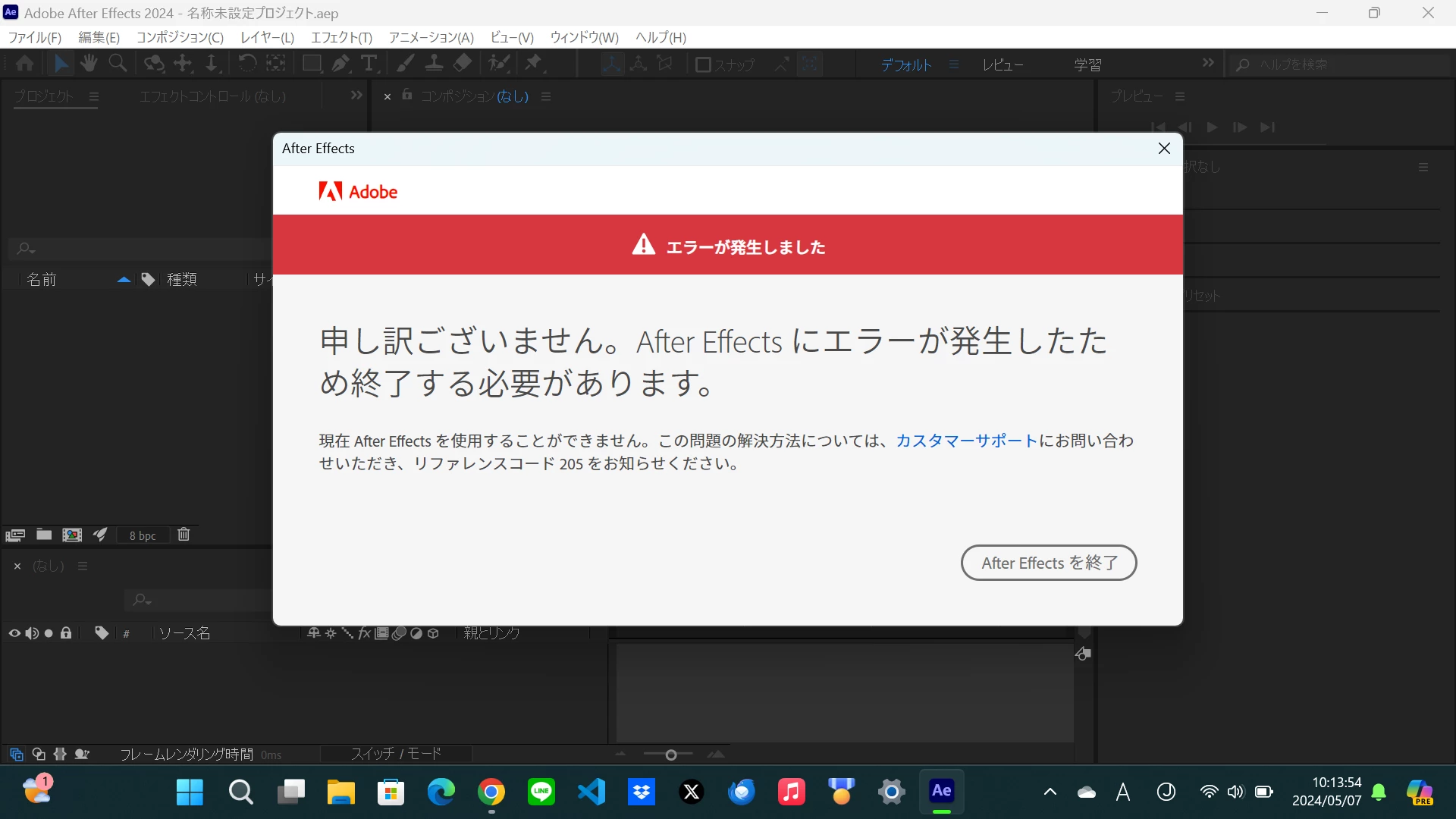 Adobe After Effectsを開くと、「申し訳ございません。After Effectsにエラーが発生したため終了する必要があります。」と出ます。(下の画像です。)