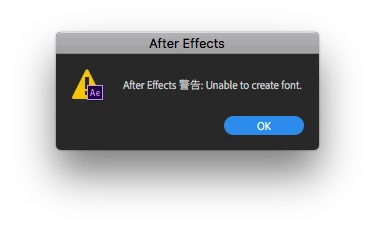「After Effects 警告:Unable to create font.」のエラーが出て、After Effectsの操作が継続できません。
