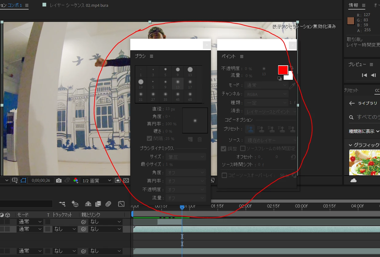 After effects 2020でペイントとブラシを表示させたらクリックできない状態になっていて使用する事ができません。詳細は画像を参照。