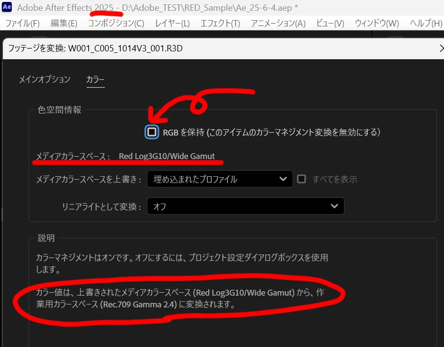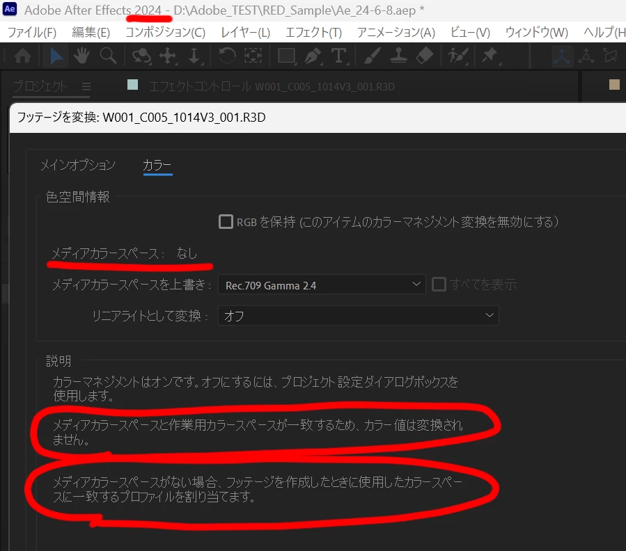 After Effects 2024 と 2025 で、R3D(RED RAW)の読み込み時のカラー挙動が異なります。