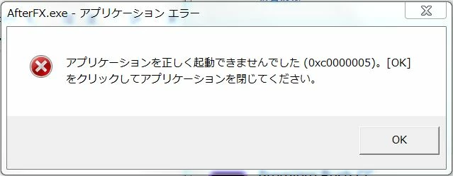 Adobe Premiere Pro および After Effects の起動時に、「アプリケーションを正しく起動できませんでした(0xc0000005)」というエラーメッセージが表示されてクラッシュする