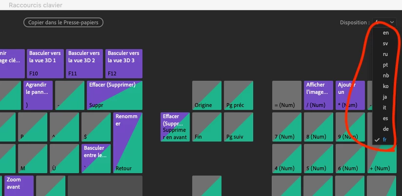 after effects CC 2019のショートカットキーのキーボードセッティングのところで、スイス フランス語 (Suisse Romand)のキーボードを追加することは可能でしょうか?