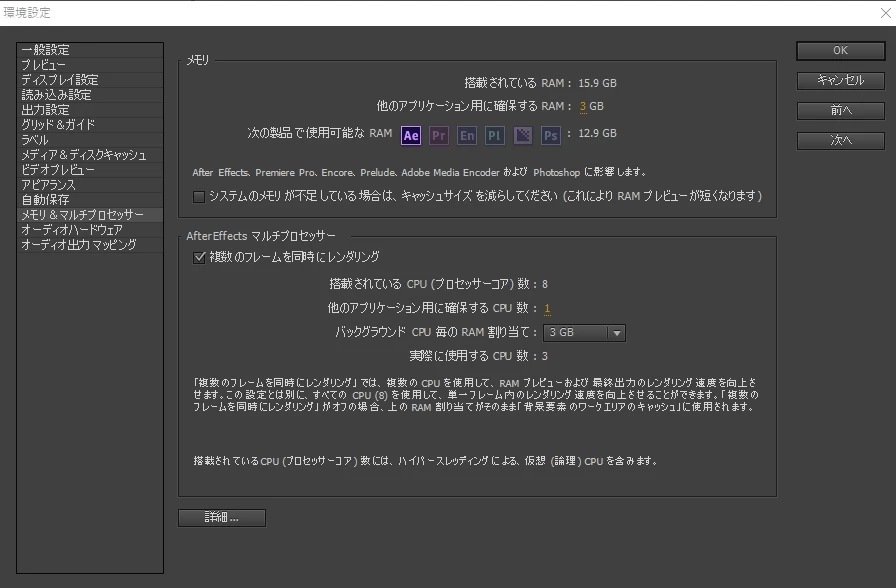 AEのメモリ&マルチプロセッサーの設定は以下になります。