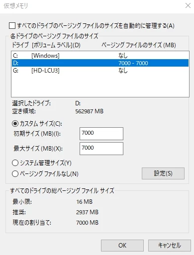 ・PCの仮想メモリが今までCドライブ(SSD)で29000MB以上だったため、Dドライブ(HDD)に変更して最小と最大を7000MBに変更