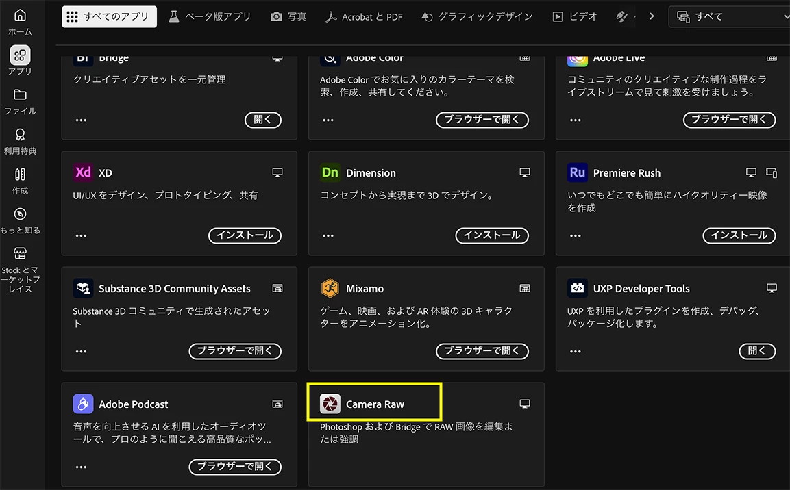 Camera RAWがインストールされているか否か、CCデスクトップアプリの下部にあるので確認して下さい。