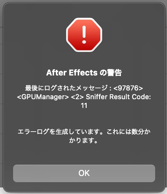 下記エラーログが出てAEが起動できなくなってしまいました。