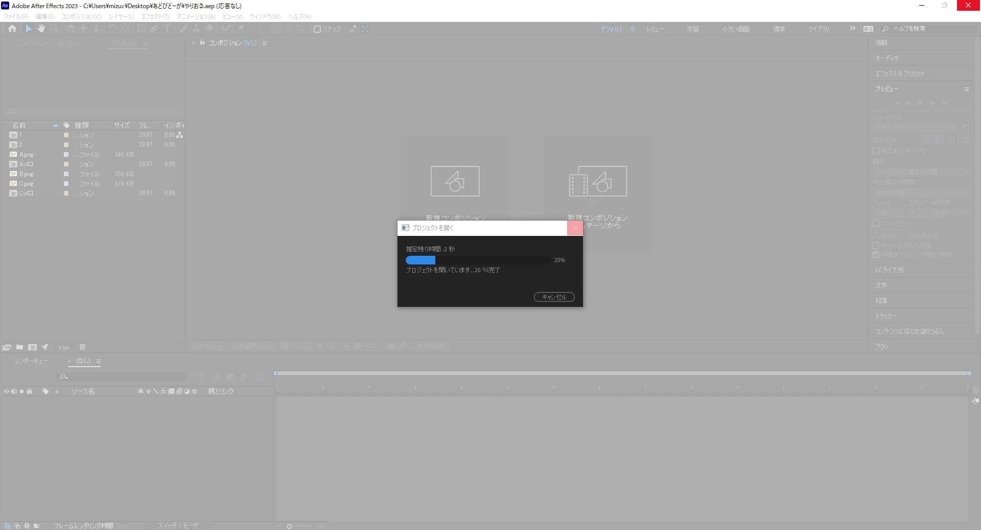 Aftereffectsのプロジェクトファイルを読み込もうとすると、読み込み20%地点で応答なしになってしまいます。