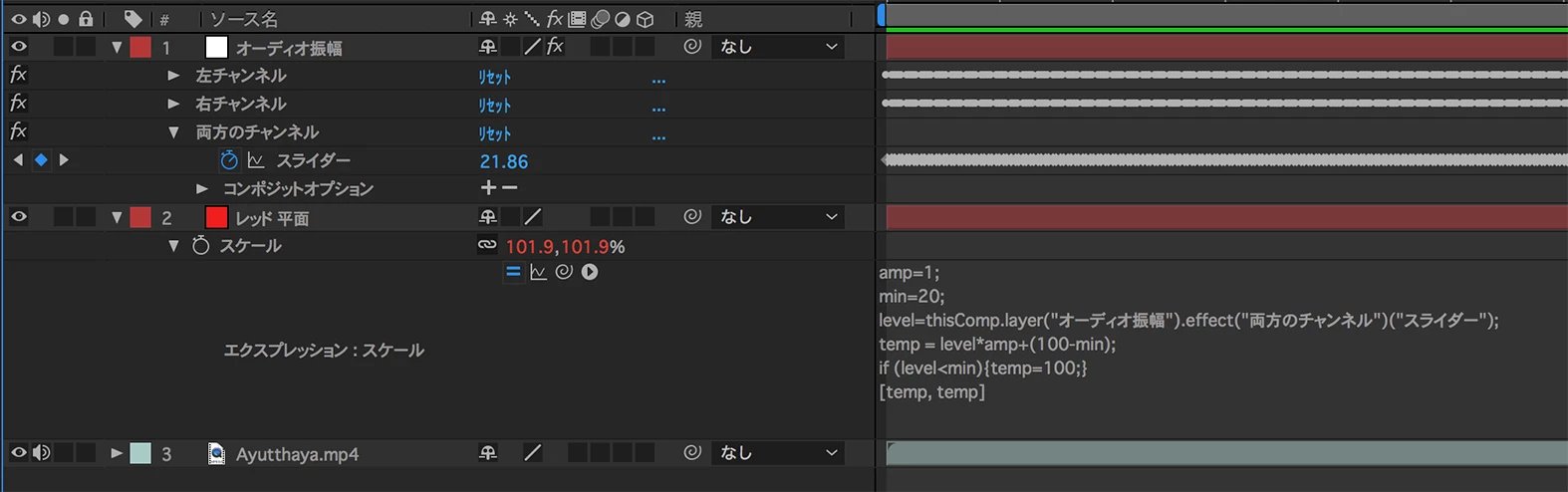 オーディオをキーフレームに変換後、エクスプレッションのスケールとピックウィップで繋ぎ、キーフレームと映像の大きさを連携させました。