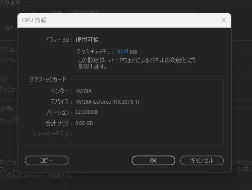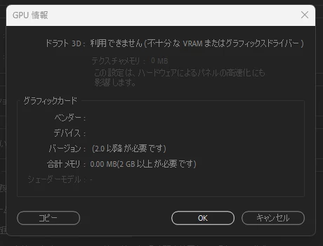 RRika_1022ParticipantForum|Forum|2 years agoApril 19, 2023質問AfterEffects2023にてGPUが利用できない。(ドラフト3Dが利用できません不十分なVRAMまたはグラフィックスドライバと表示される)Forum|Forum|2 years agoApril 19, 2023返信数 2.1159 ビューAfterEffects2023にてGPUが利用できないです。AfterEffects2022ですと利用できるのですが、2023に更新してから使えず。 GPU:Geforce RTX 3070Ti使用中。環境設定>プレビュー>GPU情報からのスクショ添付します。 知見のある方ご教示いただけますと幸いです・・・! ドラフト3Dが利用できません不十分なVRAMまたはグラフィックスドライバ というのが気になりグラフィックスドライバをNvidiaとIntel両方更新しましたがだめでした。エラーまたは問題