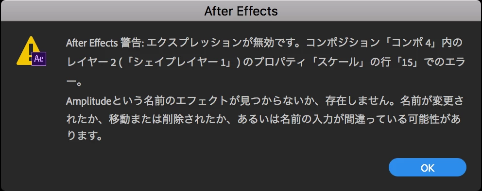 で、エクスプレッションを適用してみたところ、次のエラーメッセージが出てきました。