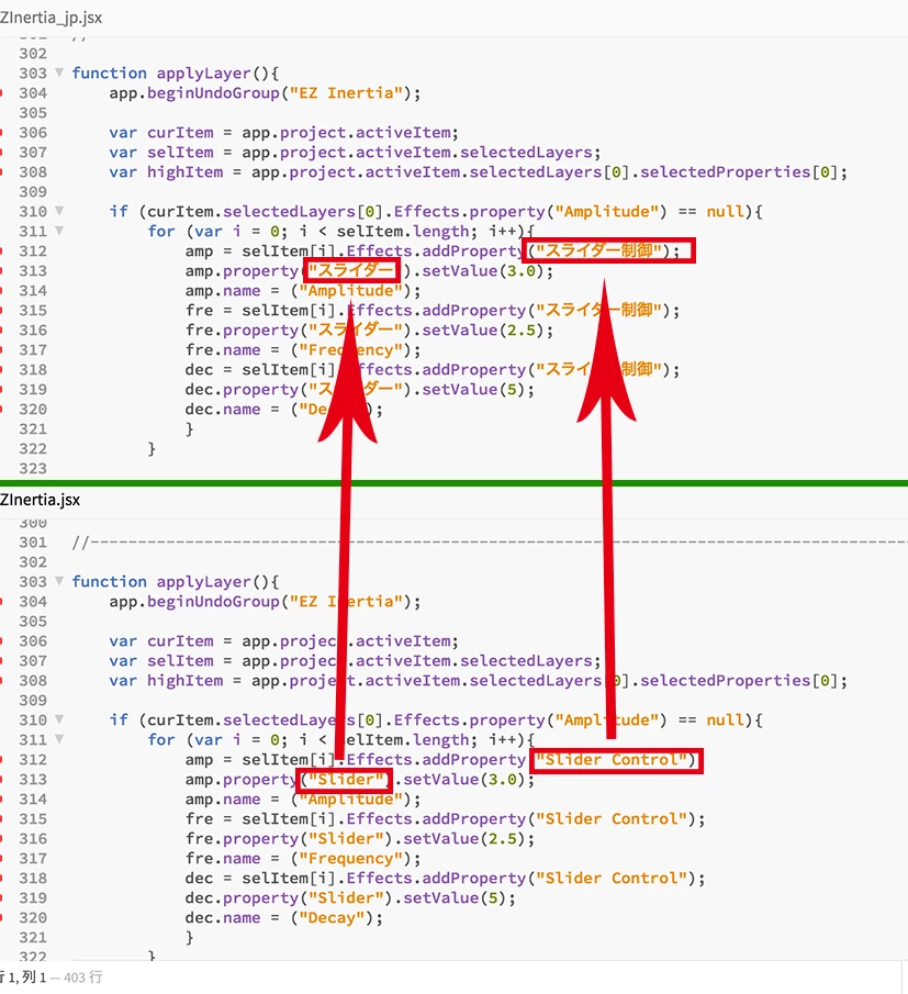 エディターを使ってスクリプトを開き、全ての 「Slider」 を 「スライダー」に、「Slider Control」 を 「スライダー制御」に変更すれば、動作します。