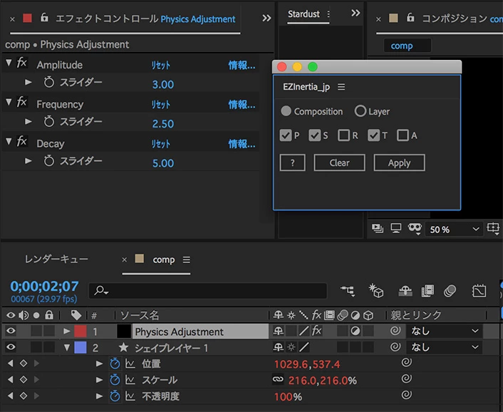 ビデオでは、スクリプトを実行すると自動でエフェクト(スライダー制御)が追加されるようになっていますが、日本語版のAfter Effectsでは正常に動作しません。