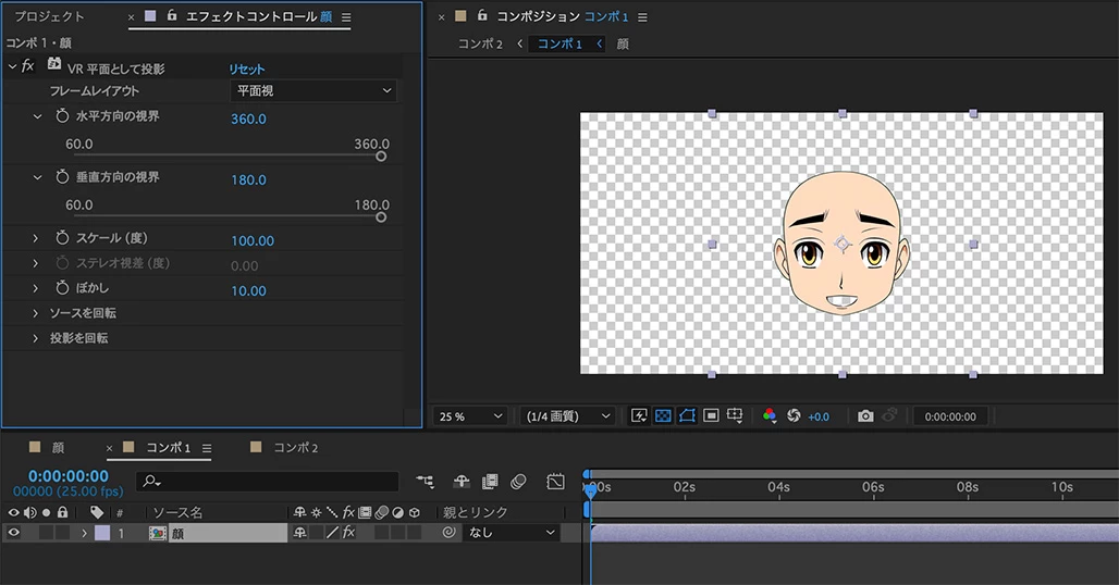 球体に変形する場合は、イマーシブビデオ関連のエフェクトを使用すると画像の歪みを少なくする事ができます。