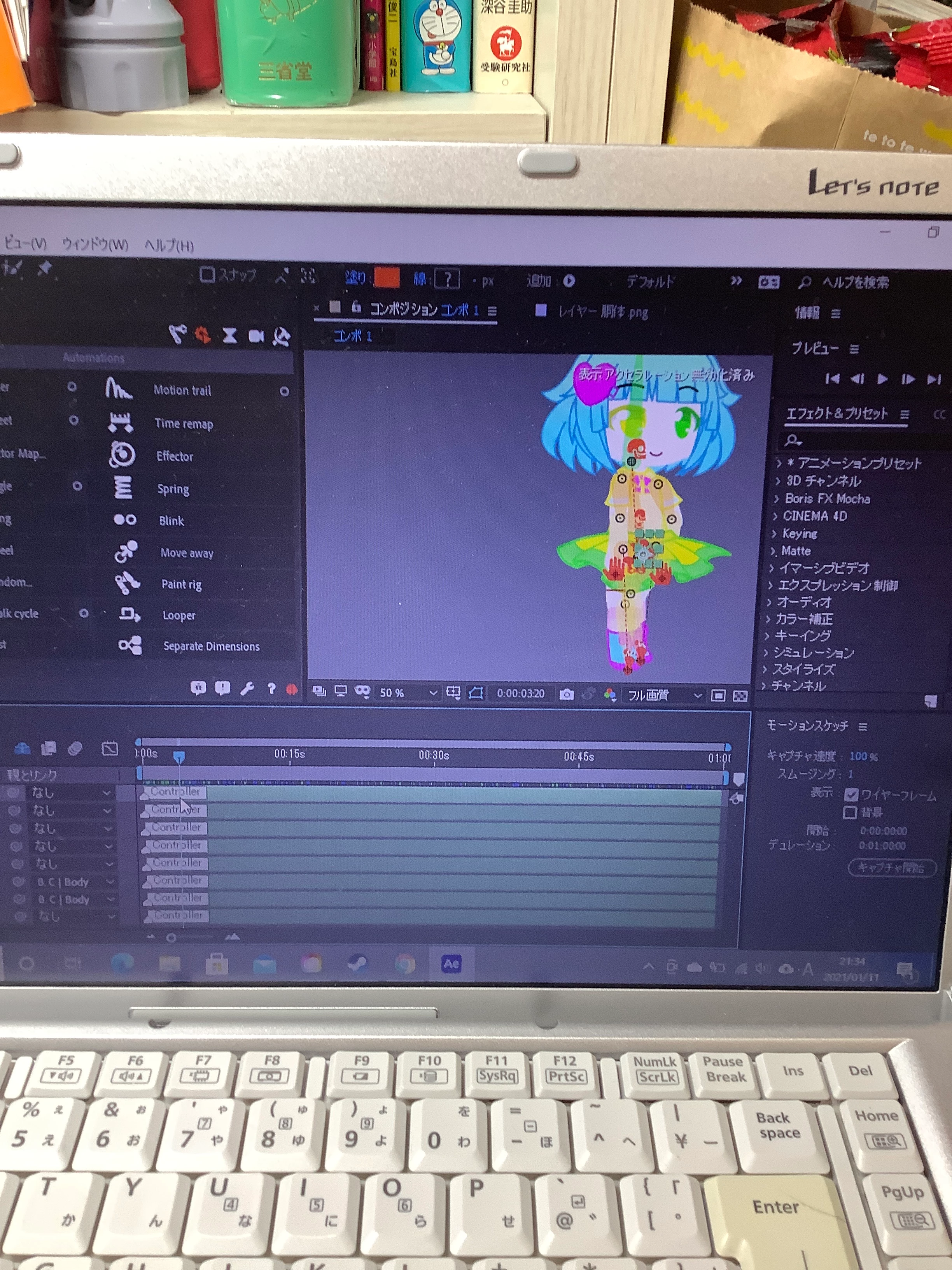 AE初心者です。Duik Bassel,2というソフトを使いGacha clubというソフトのオリキャラを動かそうと思いある海外の方の動画を参考にしつつ試しに歩かせられるツールを押してみたら動きや形がおかしくなっています。海外の動画の方は普通に歩けていましたが…何が原因かわからないです。何方か操作も兼ねて教えてくれるとありがたいです!!
