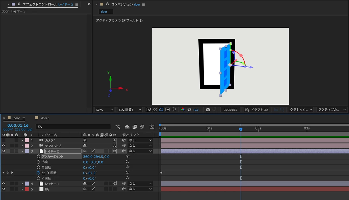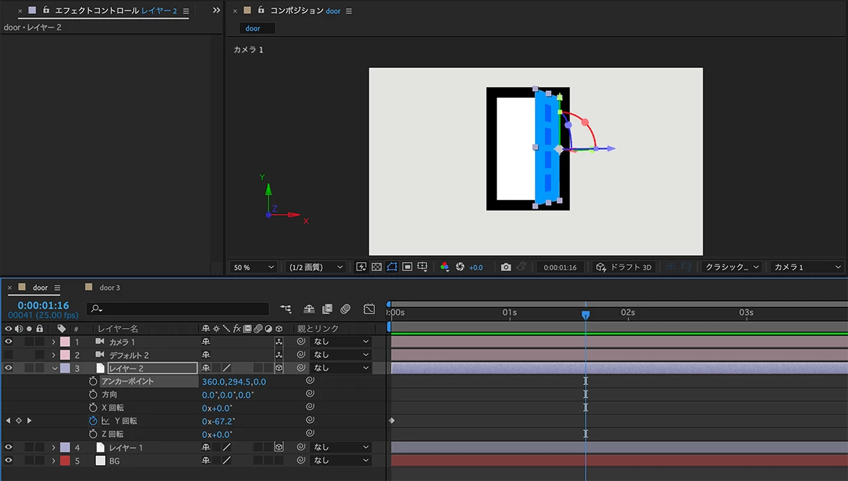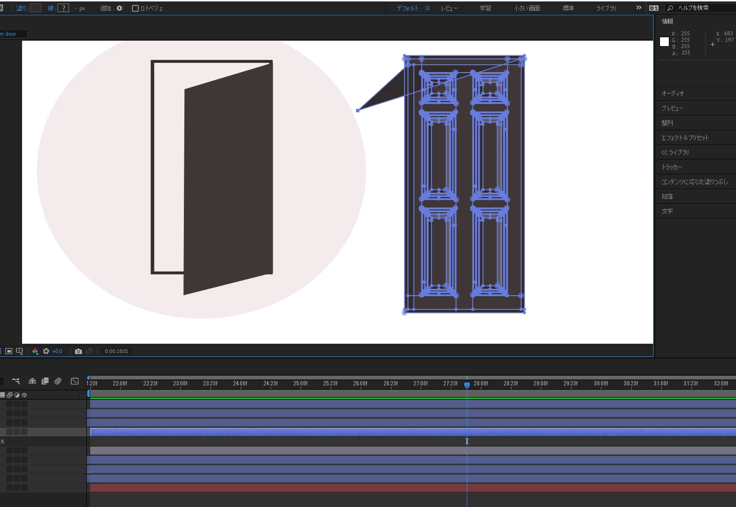 Nna227856103Known ParticipantForum|Forum|2 years agoMarch 3, 2023Questionillustratorの画像を変形させるアニメーションを作りたいForum|Forum|2 years agoMarch 3, 20233 replies681 views玄関のドアが徐々に開くアニメーションを作成したいです。ドアのイラストは、添付画像の右側のドアを使用したいです。右側のドアは、イラストレーターの画像をAEに持ってきて、「作成>ベクトルレイヤーからシェイプを作成」でシェイプレイヤーにしました。 そのあとで、ドアのパスを動かしてドアが開くアニメーションを作成しようとしたのですが、パスは1つしか動かせず、添付のように変形してしまいます。 どのような方法であれば、右側のドアが開くアニメーションを作成できますか? 調べたのですが答えが得られず、教えていただけますと幸いです。FAQ