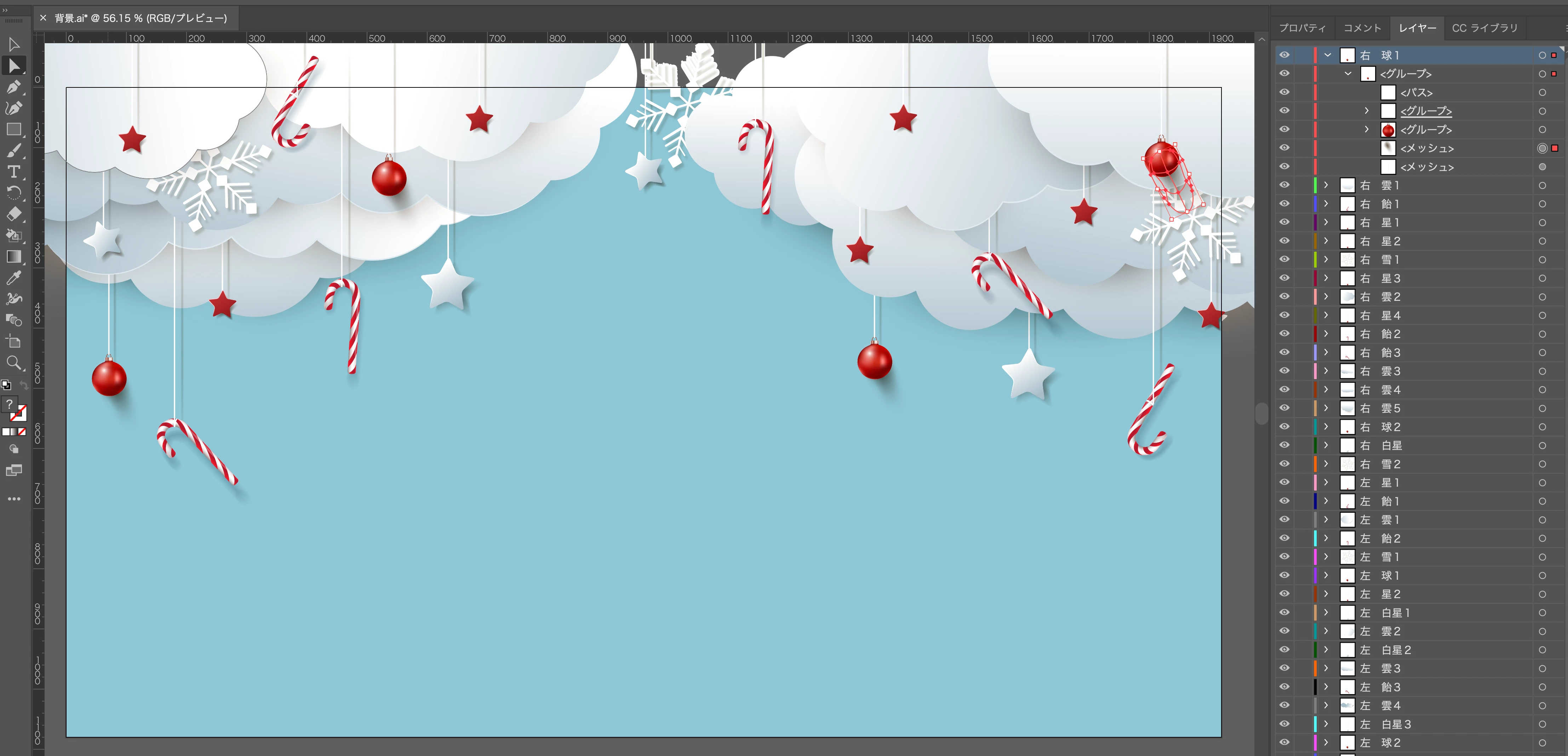 aiデータをpsdデータに読み込ませても、残念ながらレイヤーが別れず統合してしまいました。(尚、「レイヤーを保持」と「編集機能を最大限に保持」にチェックを入れた状態でも『右 球1』という名前のレイヤーのみ細かい編集が可能な状態で書き出され、その他は統合してしまいました。)