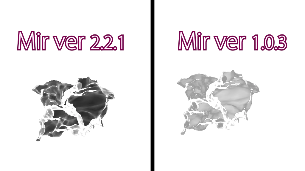 下図はデフォルトの状態でmirを付けただけのものとなりますが、前(ver1.0.3)は半透明だったのに対し、最新(ver2.2.1)のは、今まで半透明だった部分が