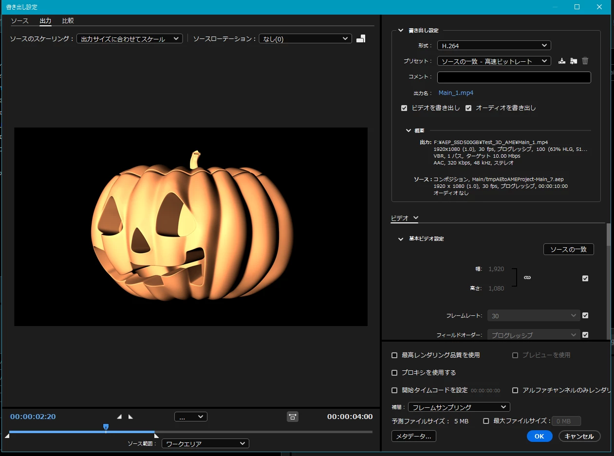 3Dモデルだけ配置したらメディアエンコーダーでも書き出しが出来ました。もう少し検証してみたいと思います。