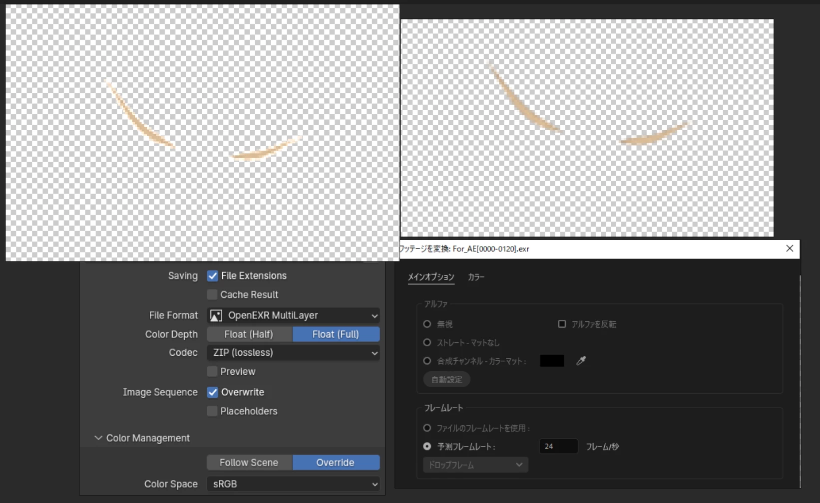 HHaruka31369137nhxdParticipantForum|Forum|9 months agoJune 30, 2025QuestionopenEXR形式ファイルの読み込みについてForum|Forum|9 months agoJune 30, 20251 reply234 viewsblenderにてopenEXR multiLayerでレンダリングをして、AEに読み込むと画像のように透過領域との境界線が白くなってしまうのですがこれをPNGで出力したときのような色で読み込む方法を教えていただきたいです。(上部左:openEXR, 上部右:PNG) AE側でアルファ設定をいじろうとしたのですが、グレーアウトしてて動かせず、プロジェクトのカラー設定をOCIOにしていろいろ設定してみてもダメでした。有識者の方、何か対処法がありましたら教えていただけると幸いです。左下はblender側での出力設定になります。FAQエラーまたは問題読み込みと書き出し