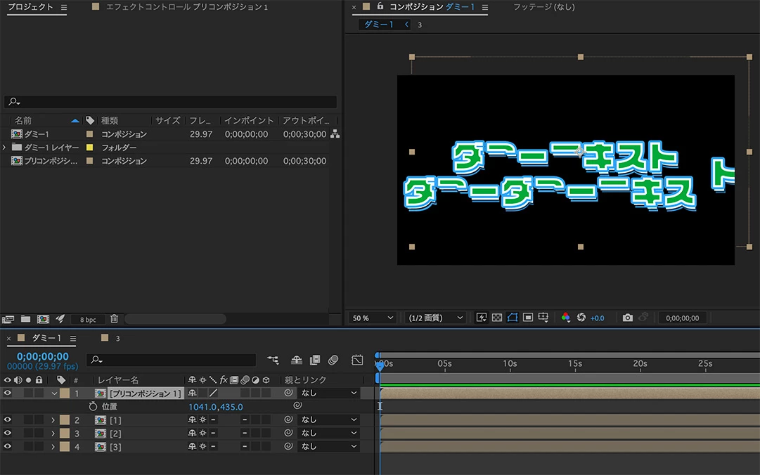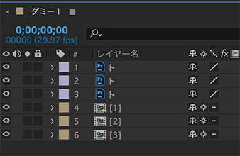 3個のファイルをAfter Effectsに読み込んで移動や回転などの動きを付けます。