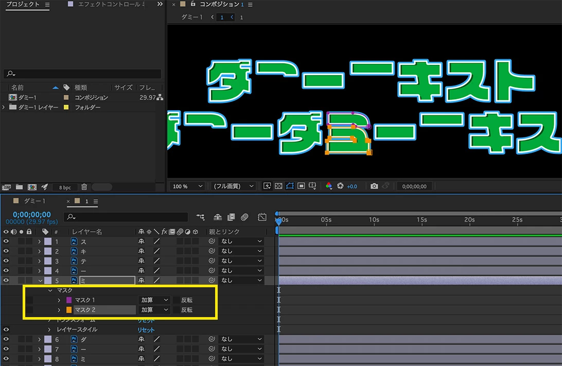 (スクショ下:そのままのもの スクショ上:表示部分を結合したもの)コンポジションとして読み込みしました。