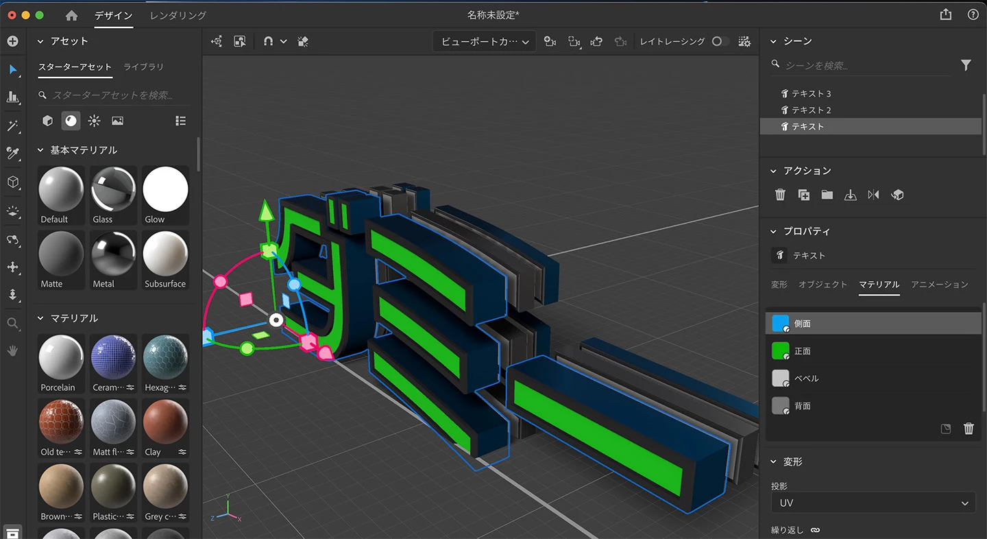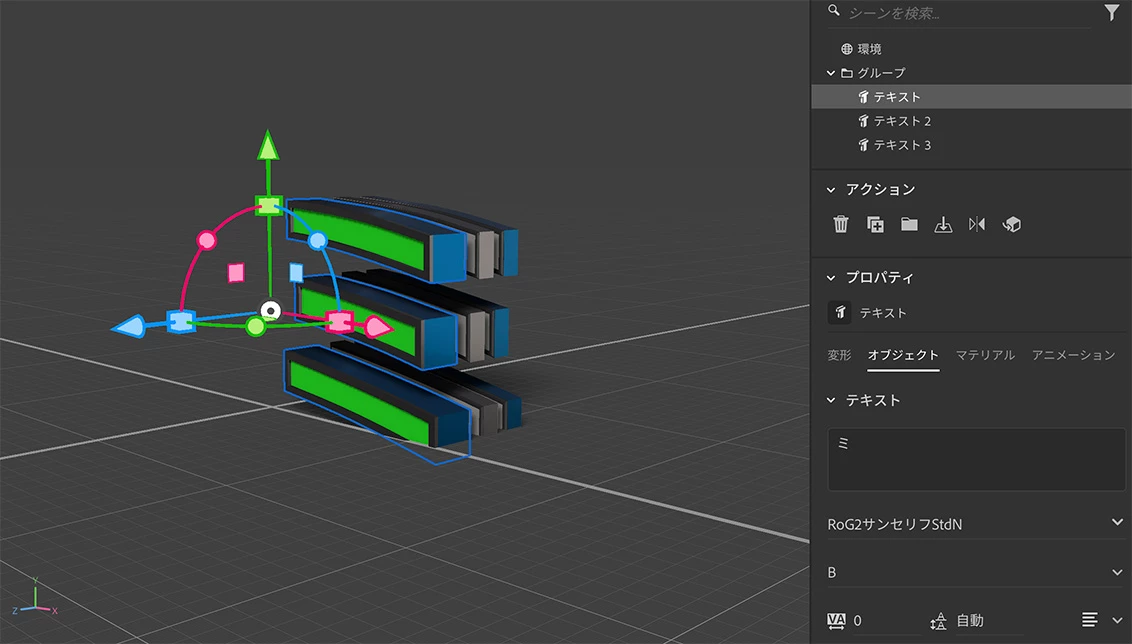 1文字づつアニメーションする場合は、マテリアルの設定をしてからテキストを1文字に書き換えてからシーンを書き出します。