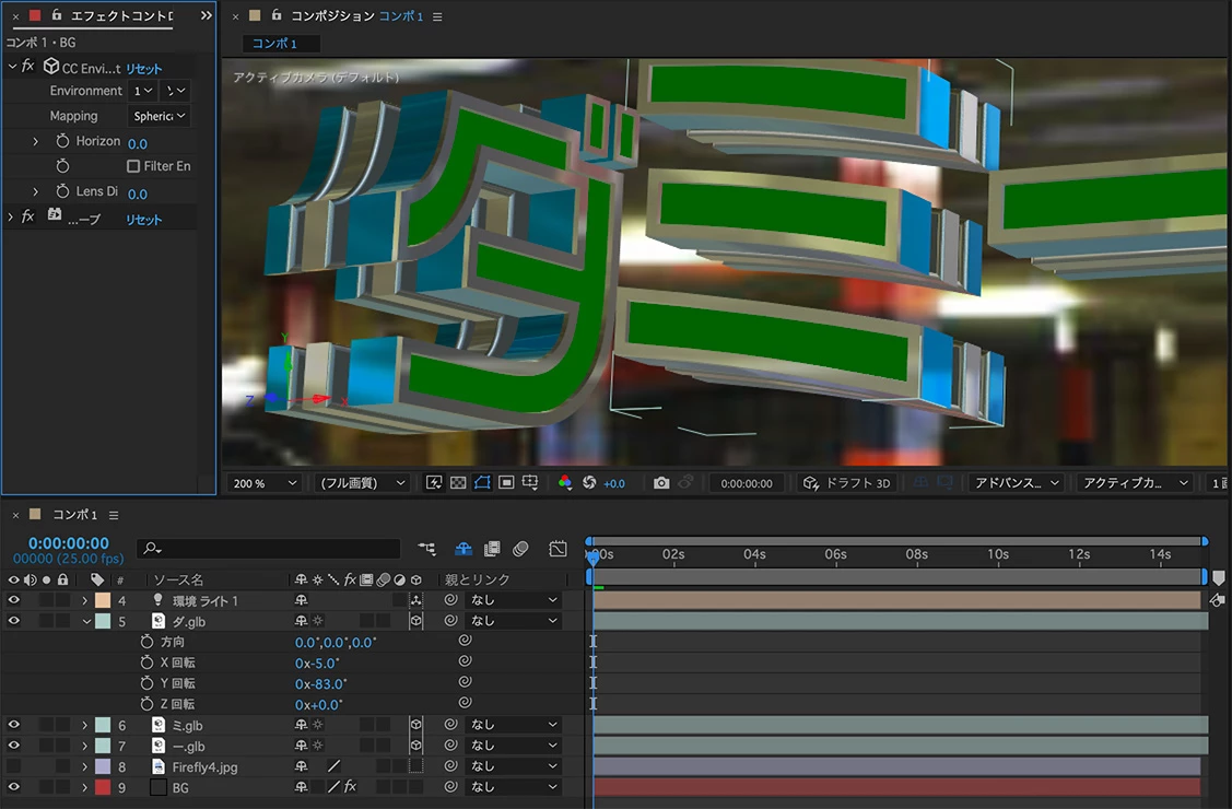 2Dで作成する3D風テキストや金属のテキストなどは、After Effectsの3D機能で作成した方が手間が少なくて良いと思います。