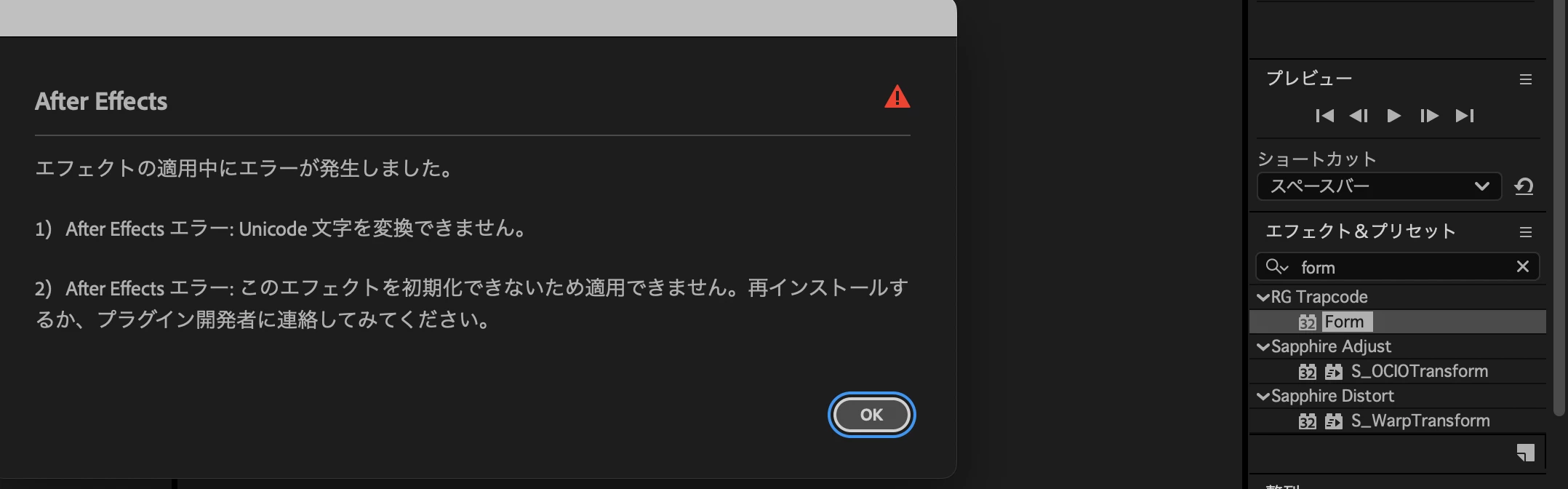 Eexcited_critic5FFCParticipantForum|Forum|1 year agoNovember 14, 2024質問RedGiant form エラーForum|Forum|1 year agoNovember 14, 2024返信数 1.352 ビューRedGiantのformをAEでエフェクトを適用しようとすると、『エフェクトの適用中にエラーが発生しました。1) After Effects エラー:Unicode 文字を変換できません。2) After Effects エラー:このエフェクトを初期化できないため適用できません。インストールするか、プラグイン開発者に連絡してみてください。』 とエラー表示が出て使用できません。AEとREDGIANTの再インストールを2回行ったのですが解決できず、、アドバイスいただきたいです。他のエフェクト『Particular』などは問題なく使用できます。エラーまたは問題