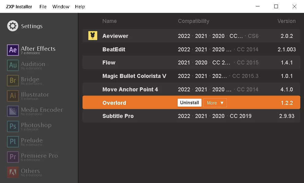 aescriptのZXPInstallerだと、アプリのダッシュボード画面から、各エクステンション・プラグインを削除できますが、上記のZXPInstallerには、そのようなダッシュボード画面がないのです。
