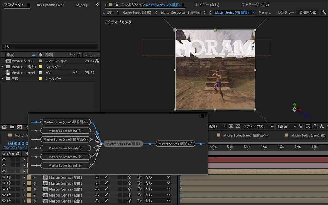 編集のフローチャートを表示させて、3Dテキストが表示されているコンポジションの設定をすべてCINEMA 4Dレンダラーに変更すれば、VR出力で3Dオブジェクトのテキストが表示されます。