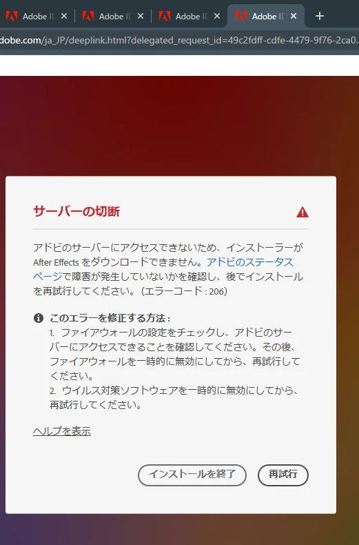 画像のとおりエラーコード206が出てしまいインストールができません。