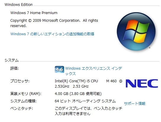 システムのプロパティ画面に表示されているのは