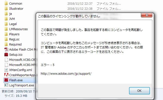 ちなみに、FlashProCS4関連のフォルダを丸ごと新しいPCの C:\Program Files\Adobe の下にコピーしても同じなります。