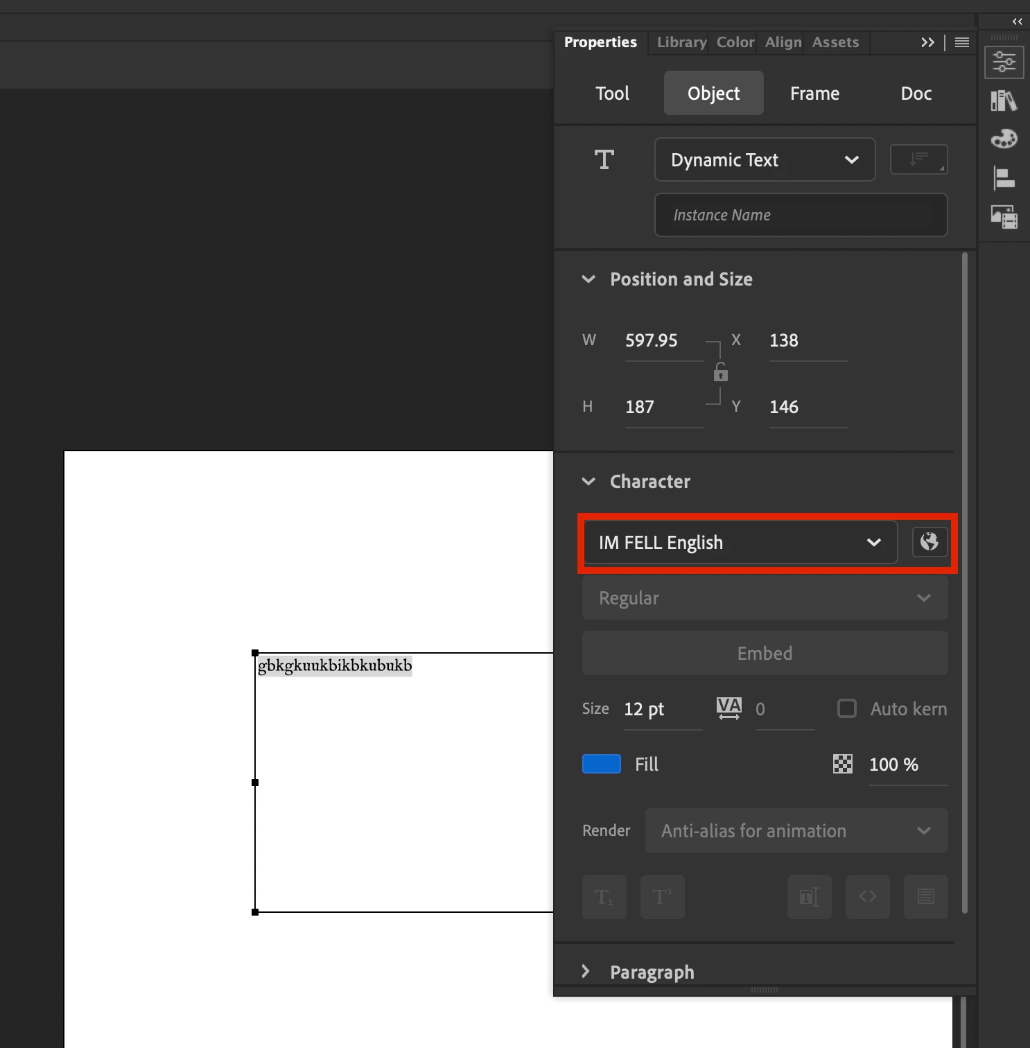 AnimateCC2017にてtypekitフォント「IM FELL English」を使用しようと思っています。