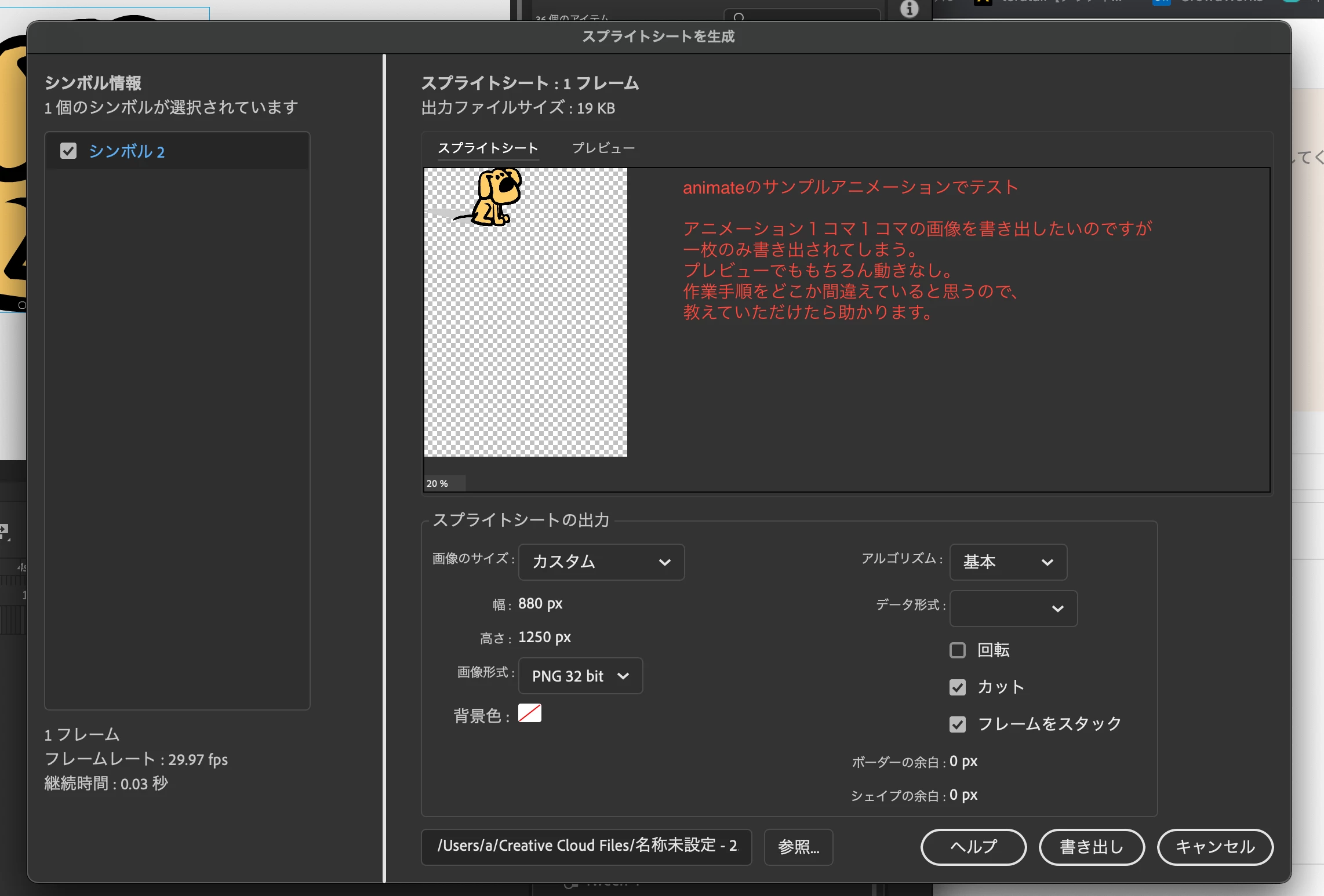 こちらの記事などを参考に、animateで作成したスプライトシートを書き出したいのですが、