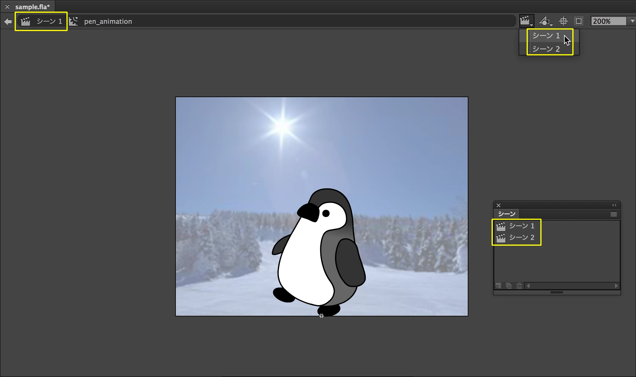 Animate cc 2017の使い方で、シーン1の表示がわからない。
