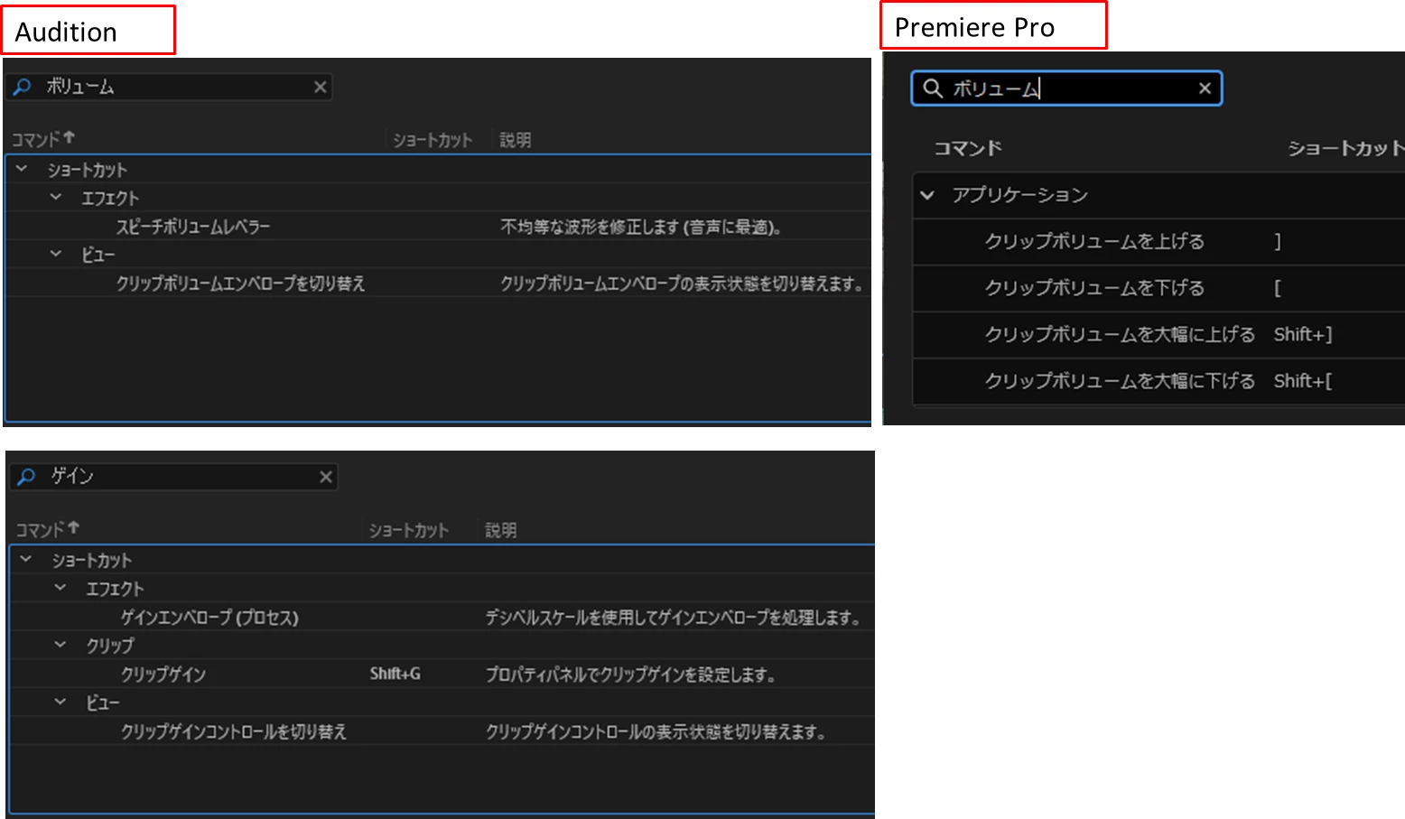 Premiere proではクリップボリュームを上げる というショートカットを使ってクリップの音量を調節しているのですが、Auditionでは該当するショートカットが見つかりません。