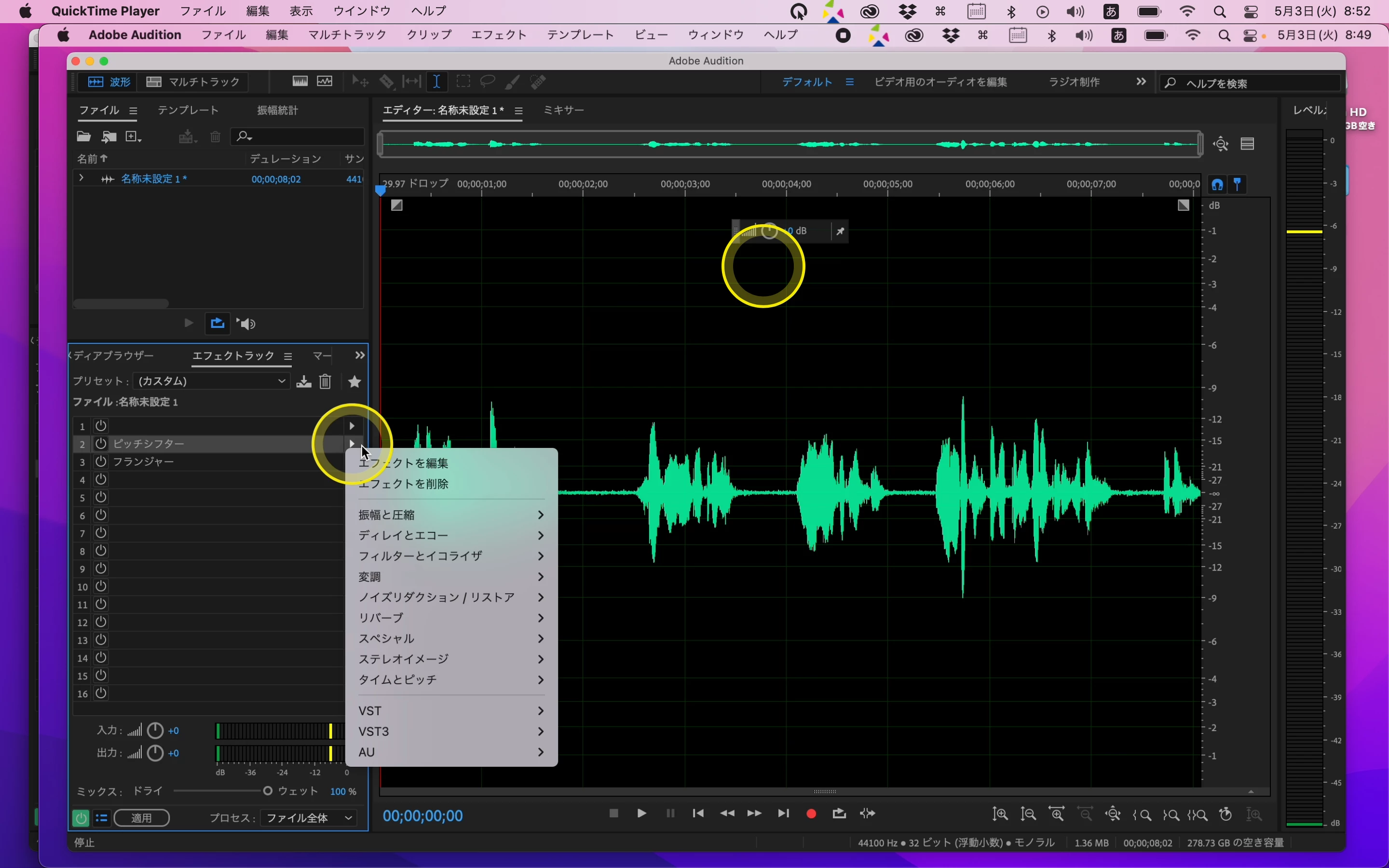 ユウチューブで解説動画を作成の際、AI音声読み上げソフトを使っていたのですが、書き出して、出力するのが手間で、地声でナレーション音声を取り、機械音声のように合成して、作業効率上げて、編集できないかと模索中です。