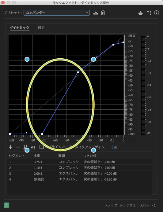 エフェクト「ダイナミクス操作」でプリセットの「コンパンダー」を使うと、一定音量以下(声が出ていないタイミング)のみ音量が絞られるので、ノイズリダクションを補足することができます。音源の状態により語尾の切れ際などが不自然になる場合もあるので、その際は上記画像の丸で囲った線の部分(右上の点が音量低下の始まるレベル、左下が無音になるレベル)を動かして感度を調整します。