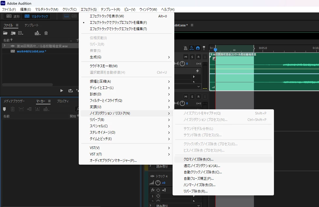 クリップで数秒を選択した状態で、「エフェクト」から「ノイズ…リストア」を開いても、添付画像のように、「ノイズプリントをキャプチャ」以降「ヒスノイズ除去」までがグレー表示になって選択できません。