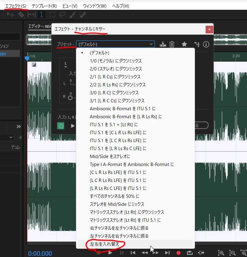 波形編集にて、単純に「左右を入れ替える」ということですと、エフェクト-振幅と圧縮-チャンネルミキサーを用いて、プリセットの「左右を入れ替え」を選んでいただくとうまくゆくのではないかと思います。