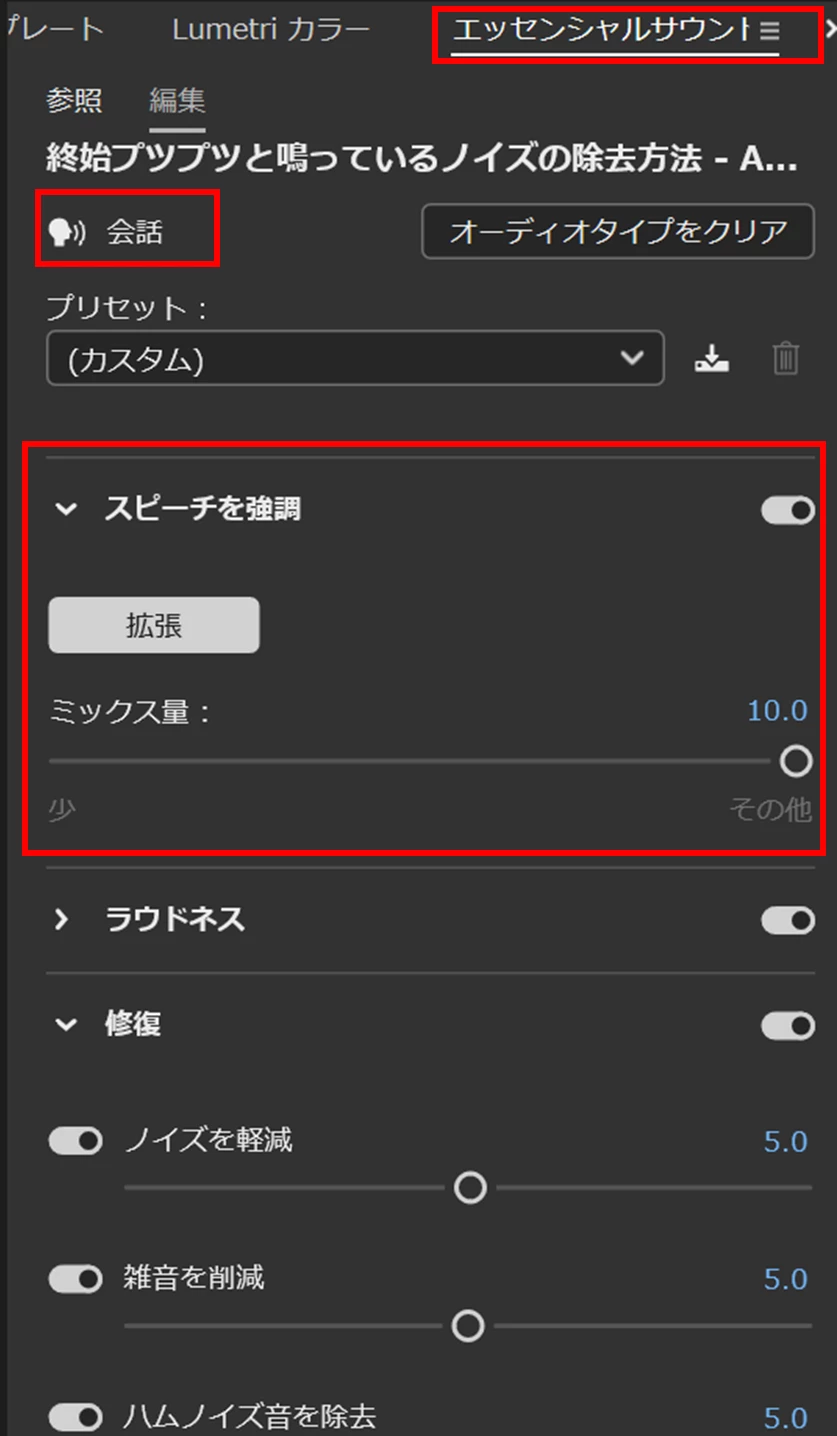 参考に試してみました。Premiere Proに添付いただいたファイルを読み込み、「スピーチを強調」機能を適用し、「会話」を選択して「ミックス量」のみを最大にしました。