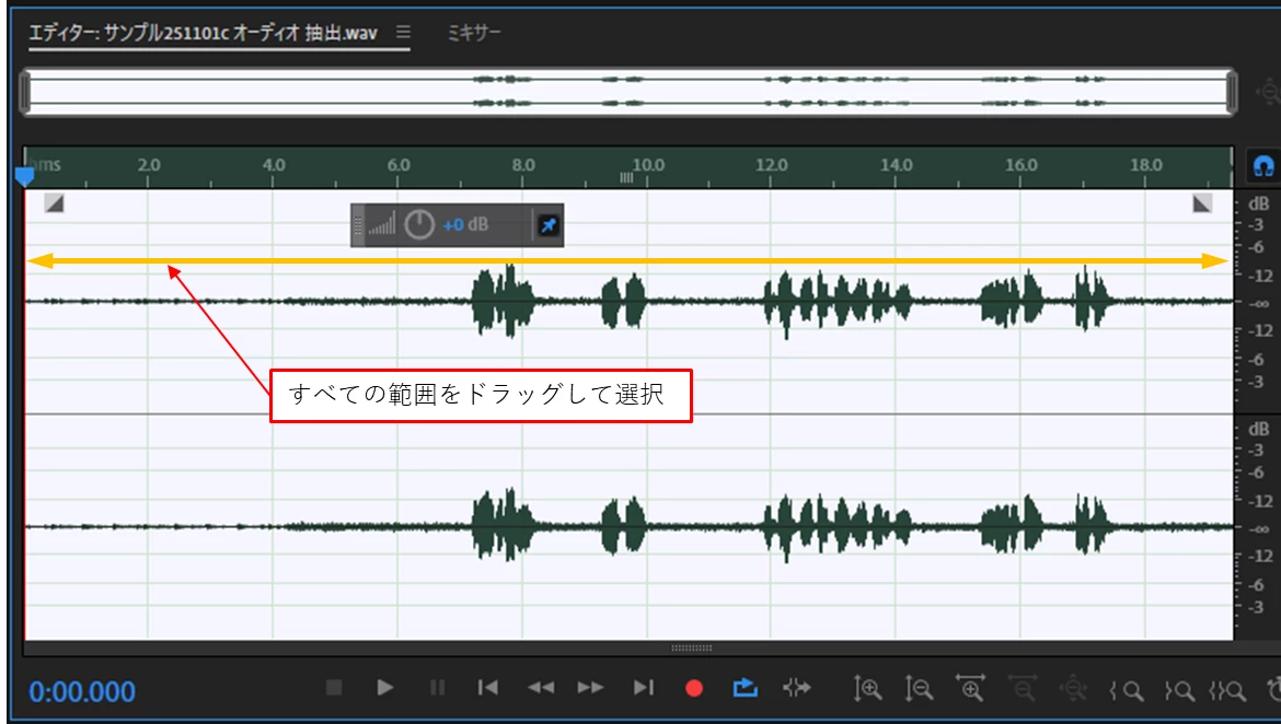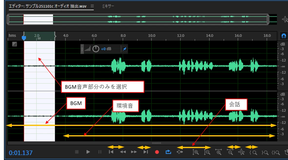 ①音声ファイルを読み込み、BGM音声部分のみをドラッグして1~2秒程度選択します。会話や他の音声が含まれているとBGMを検出する精度が落ちます。