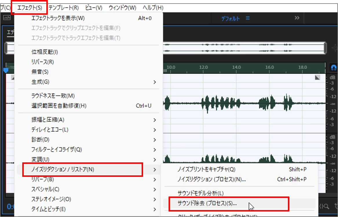 ⑤メニューの「エフェクト」→「ノイズリダクション/リストア」→「サウンド除去(プロセス)」を選択します。